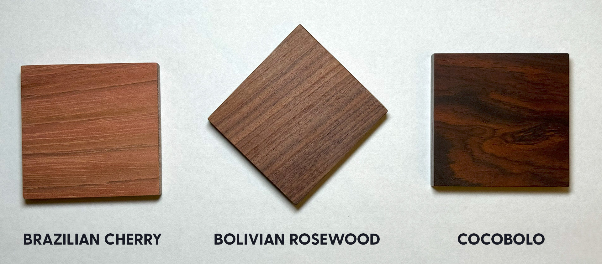 A striking blend of orange, red, and espresso hues. The showpiece of tropical hardwoods, admired for its natural oil content and vibrant depth. Pricing starts at $75.